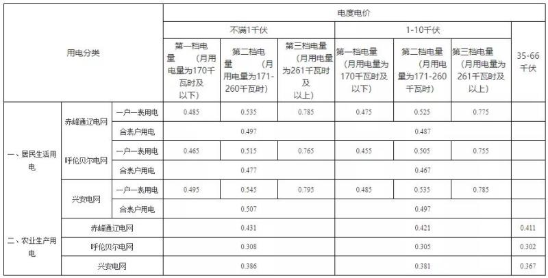 注:1.上表所列價(jià)格,均含國(guó)家重大水利工程建設(shè)基金0.1125分錢(qián)。2.上表所列價(jià)格,除農(nóng)業(yè)生產(chǎn)用電外,均含大中型水庫(kù)移民后期扶持資金0.23分錢(qián)、可再生能源電價(jià)附加0.1分錢(qián)。3.對(duì)城鄉(xiāng)“低保戶(hù)”和農(nóng)村牧區(qū)“五保戶(hù)”家庭每戶(hù)每月設(shè)置15度免費(fèi)用電基數(shù),分別按照表中居民生活用電第一檔電量電價(jià)標(biāo)準(zhǔn)收取及返還。4.對(duì)執(zhí)行居民生活用電、農(nóng)業(yè)生產(chǎn)用電的電壓等級(jí)在35-110千伏及以上的用戶(hù),按表中1-10千伏所對(duì)應(yīng)的電度電價(jià)標(biāo)準(zhǔn)執(zhí)行。