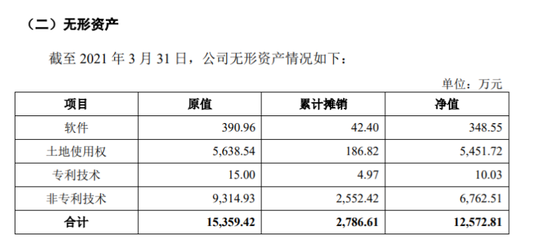 截至2021年3月31日,湖南裕能無形資產(chǎn)中,專利技術(shù)凈值10.03萬元,非專利技術(shù)凈值6762.51萬元。