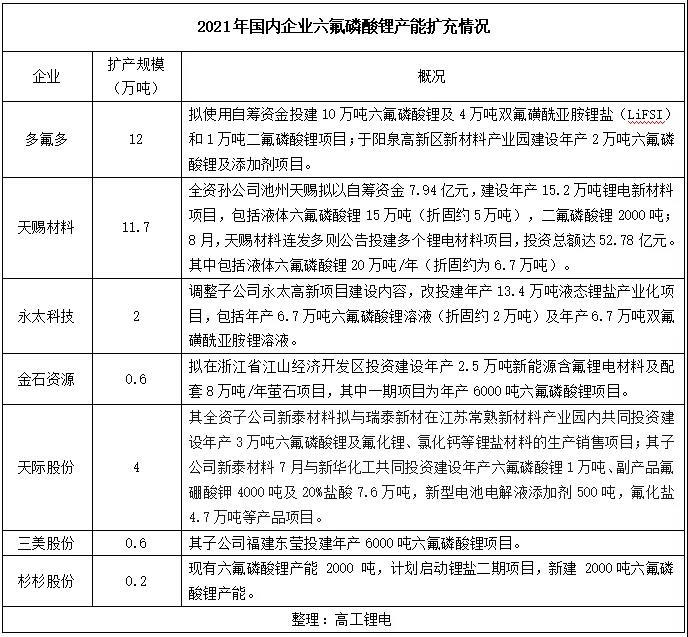 供需矛盾日益緊張,除多氟多外,天賜材料、永太科技、金石資源、天際股份、三美股份、杉杉股份等多家企業(yè)紛紛加碼六氟磷酸鋰,擴充產(chǎn)能。據(jù)不完全統(tǒng)計,新增產(chǎn)能超30萬噸。