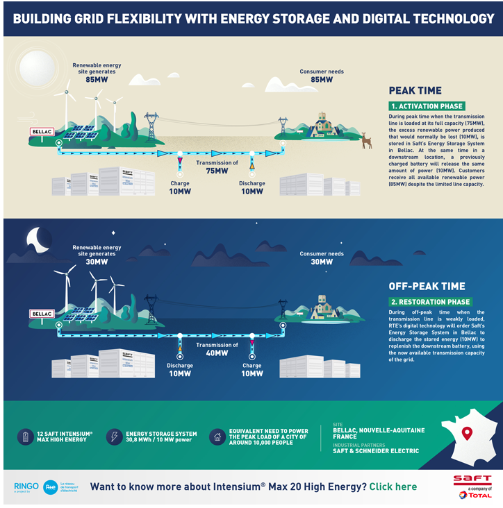 在通常情況下,電網(wǎng)運營商可以通過調(diào)峰來管理峰值電力需求。在這種模式下,電池儲能系統(tǒng)將在電力充足、市場價格較低時儲存能量,并在電力需求回升且價格更高時提供電力。RTE公司是一家受監(jiān)管的公用事業(yè)公司,其使命是用戶提供更好的電力服務。因此能不會通過影響能源的價格或可用性來干擾電力市場。RTE公司并不是簡單地進行調(diào)峰,而是為RINGO儲能項目開發(fā)了一個新概念,其中在法國各地運營的儲能系統(tǒng)將同時存儲和釋放能量。這確保了可再生能源得到充分利用——換句話說,避免了限電措施;還將克服輸電基礎設施中可能存在的瓶頸,而不會隨時影響電網(wǎng)上的凈電量。在RINGO儲能項目的早期階段,儲能系統(tǒng)提供商Saft公司就儲能系統(tǒng)的功能及其在電網(wǎng)中的作用向RTE公司提供了建議。其目標是幫助RTE公司評估一種在技術和經(jīng)濟上可行的先進的電池儲能解決方案。