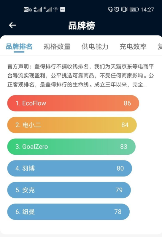 由于產(chǎn)品定位的原因,居民在只為滿足應(yīng)對(duì)停電需求而購(gòu)買(mǎi)商品時(shí),會(huì)更多關(guān)注“經(jīng)濟(jì)實(shí)惠”。但如果將戶外工作、自駕游、露營(yíng)等需求都進(jìn)行考慮的話,產(chǎn)品性能和功能設(shè)計(jì)將會(huì)成為消費(fèi)者買(mǎi)單的第一要素,此時(shí)價(jià)格的權(quán)衡比重將會(huì)減輕。以蓋得排行在今年5月份發(fā)布的榜單為例,EcoFlow正浩位居榜首。