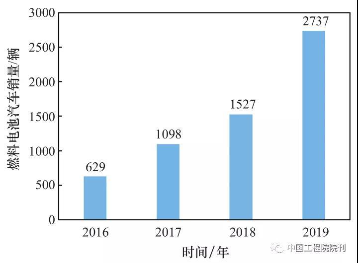 2016—2019 年,國內(nèi)燃料電池汽車銷量大幅增加(見圖 1)。根據(jù)中國汽車工業(yè)協(xié)會《2019 年汽車工業(yè)經(jīng)濟(jì)運(yùn)行情況》數(shù)據(jù)統(tǒng)計(jì), 2019 年我國燃料電池汽車產(chǎn)銷量分別為 2833 輛、2737 輛,同比增長 85.5%、79.2%。2020 年上半年因新型冠狀病毒肺炎疫情原因?qū)е庐a(chǎn)銷量有所下降。截至2020年6月,我國燃料電池汽車?yán)塾?jì)銷售超過 6000 輛。從汽車銷量數(shù)據(jù)來看,我國燃料電池汽車產(chǎn)業(yè)發(fā)展方向與國外存在明顯不同:美國、日本、韓國和歐盟的燃料電池汽車推廣以乘用車為主,而我國以商用車為主,已實(shí)現(xiàn)量產(chǎn)并投入規(guī)?;\(yùn)營。