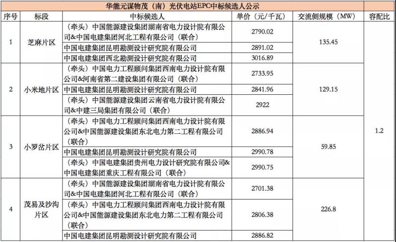 11月1日,華能元謀物茂(南)光伏電站(550MW復合型光伏項目)EPC中標結(jié)果公示。從評標價格來看,報價穩(wěn)定在2.7~3元/瓦,最低中標價為2701.38元/千瓦,即2.7元/瓦。