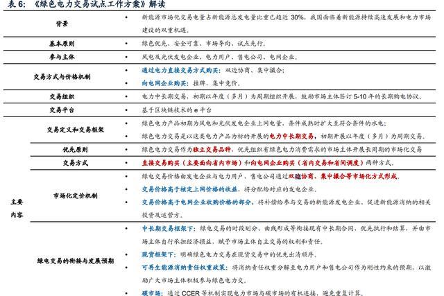 綠電交易凸顯清潔能源環(huán)境價(jià)值,風(fēng)光配儲(chǔ)價(jià)值進(jìn)一步凸顯。在積極推動(dòng)新一 輪電力體制改革的大背景下,新能源市場(chǎng)化交易電量占新能源總發(fā)電量比重已趨近 30%,新能源持續(xù)高速發(fā)展和電力市場(chǎng)建設(shè)為新型電力系統(tǒng)帶來雙重機(jī)遇。2021年 9月7日,國(guó)家發(fā)改委正式批復(fù)《綠色電力交易試點(diǎn)工作方案》,從交易框架、優(yōu)先 原則、交易方式、定價(jià)機(jī)制和發(fā)展預(yù)期五方面明確綠電交易的發(fā)展規(guī)劃,強(qiáng)化綠電 的綠色屬性和環(huán)境價(jià)值,通知印發(fā)后的首個(gè)交易日,首批綠電交易價(jià)格較當(dāng)?shù)仉娏?中長(zhǎng)期交易價(jià)格溢價(jià)0.03-0.05元/千瓦時(shí),溢價(jià)率約10%,綠電的高環(huán)境價(jià)值加速刺 激風(fēng)光儲(chǔ)一體化發(fā)展。