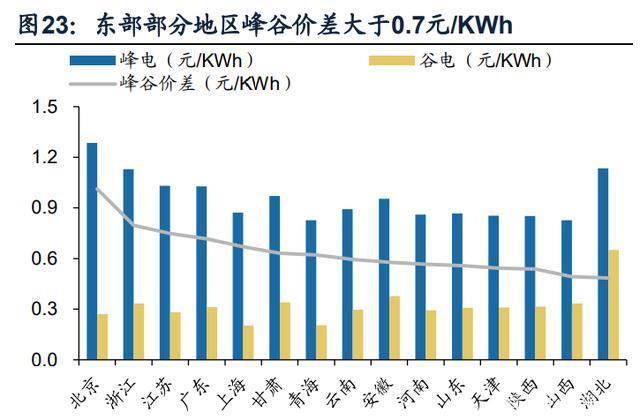 用戶側(cè)儲(chǔ)能需求激活,工商業(yè)配儲(chǔ)潛力打開。用戶側(cè)儲(chǔ)能主要目的在于分時(shí)電 價(jià)管理和兩部制電價(jià)下的容量電費(fèi)管理,據(jù)我們測(cè)算在1.5元/Wh的儲(chǔ)能系統(tǒng)成本下, 峰谷價(jià)差大于0.7元/KWh可實(shí)現(xiàn)超10%的內(nèi)部收益率,配儲(chǔ)降本優(yōu)勢(shì)顯著。目前僅 北京、浙江、江蘇、廣東等東部主要省份工商業(yè)峰谷價(jià)差高于0.7元/KWh,政策明 確擴(kuò)大峰谷價(jià)差將進(jìn)一步驅(qū)動(dòng)工商業(yè)配儲(chǔ)。未來伴隨峰谷價(jià)差進(jìn)一步擴(kuò)大、浮動(dòng)電 價(jià)制度推進(jìn)疊加儲(chǔ)能持續(xù)降本,儲(chǔ)能的“投資品”屬性愈發(fā)凸顯。