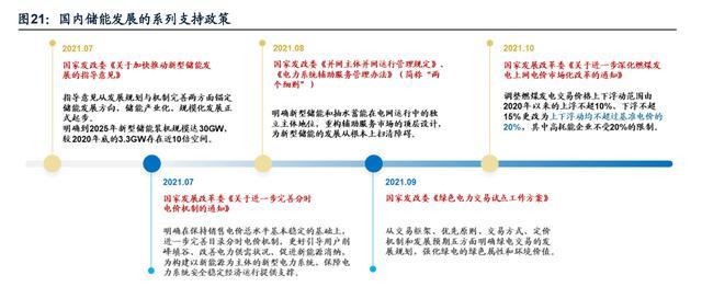 而對(duì)于制約儲(chǔ)能發(fā)展的機(jī)制問題,《指導(dǎo)意見》從市場(chǎng)地位、價(jià)格機(jī)制和激勵(lì) 機(jī)制三方面著手優(yōu)化,并在后續(xù)政策中有所體現(xiàn),例如明確儲(chǔ)能的市場(chǎng)主體地位在 2021年8月份發(fā)布的新版“兩個(gè)細(xì)則”中明確、完善峰谷價(jià)差政策在2021年7月份發(fā)布的《關(guān)于進(jìn)一步完善分時(shí)電價(jià)機(jī)制的通知》中明確。我們認(rèn)為未來隨著儲(chǔ)能支持 政策的出臺(tái)提速,《指導(dǎo)意見》中的綱領(lǐng)性意見將由相關(guān)領(lǐng)域的政策文件補(bǔ)充,具 體細(xì)則有望持續(xù)優(yōu)化儲(chǔ)能發(fā)展模式,進(jìn)一步打開行業(yè)發(fā)展空間。