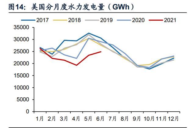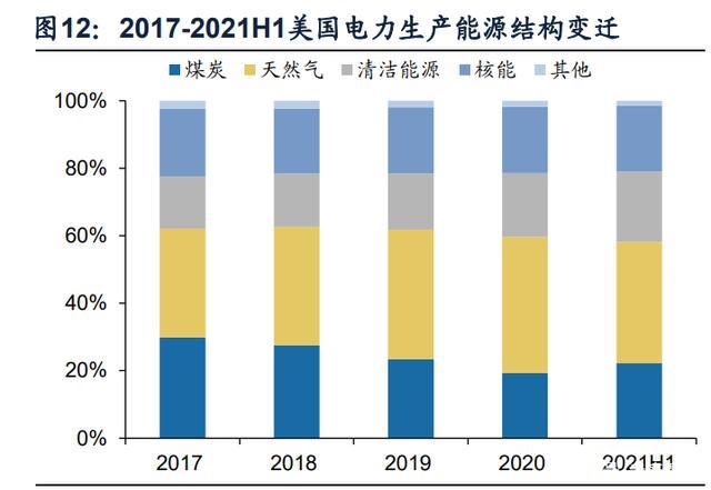 水電、風(fēng)電具備明顯的季節(jié)特性,歐美異常氣候?qū)е绿烊粴馓娲枨笤鲩L(zhǎng)與電 力缺口產(chǎn)生。歐洲方面,2021 年以來長(zhǎng)時(shí)間超高壓氣候?qū)е潞I巷L(fēng)速下降,風(fēng)力 發(fā)電量隨之下降,作為歐洲傳統(tǒng)的風(fēng)力發(fā)電旺季,在 2020 年風(fēng)電裝機(jī)新增14.7GW, 裝機(jī)規(guī)模增長(zhǎng) 7.87%的條件下,2021H1 歐洲風(fēng)力發(fā)電量同比下降 7.47%。而美國(guó) 則受極端干旱天氣影響,2-6 月月度水力發(fā)電量均低于過去四年同期水平,2021H1 水力發(fā)電量同比下降12.59%,水電占比從2020年7.26%下降至2021H1的6.95%。 水電、風(fēng)電的不足致使歐美電力市場(chǎng)的天然氣替代需求提升,而天然氣供給短缺又 進(jìn)一步拉大電力缺口。