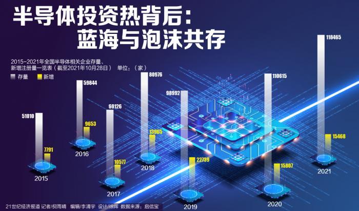 從新增企業(yè)數(shù)量維度,啟信寶數(shù)據(jù)顯示,目前國(guó)內(nèi)半導(dǎo)體相關(guān)企業(yè)存量超過(guò)10萬(wàn)家,2019年全國(guó)半導(dǎo)體相關(guān)企業(yè)新增注冊(cè)量超過(guò)了2萬(wàn)家,達(dá)到了近5年高峰,2020年超過(guò)1.5萬(wàn)家,數(shù)值有所回落,但仍在高位,截至2021年10月28日新增量達(dá)到了15468家,已經(jīng)接近去年全年的新增量。