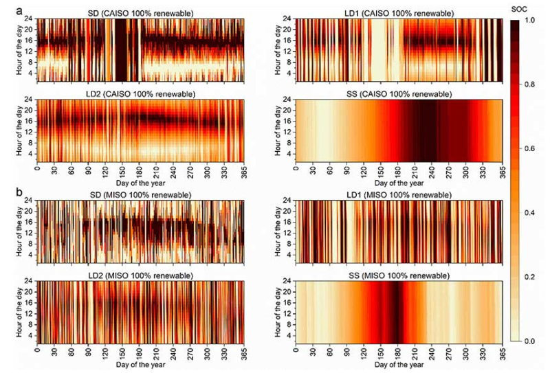 加州獨立系統(tǒng)運營商(CAISO)和美國中大陸獨立系統(tǒng)運營商(MISO)中短期儲能系統(tǒng)(SD)、長時儲能系統(tǒng)(LD1和LD2)和季節(jié)性儲能系統(tǒng)(SS)的荷電狀態(tài)(SOC)。(a)CAISO具有100%可再生能源組合設備的標準化SOC。(b) MISO具有100%可再生能源組合設備的標準化SOC。SOC=1(深紅色)表示儲能系統(tǒng)已充滿。SOC=0(淺紅色)表示儲能設備為空。