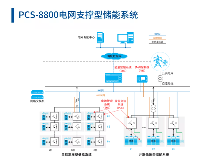 為了提升電池儲能系統(tǒng)對新型電力系統(tǒng)的支撐能力,南瑞繼保研制了PCS-8800電網(wǎng)支撐型儲能系統(tǒng)。該系統(tǒng)包括功能全面的能量管理系統(tǒng)(EMS)、電網(wǎng)友好的功率管理系統(tǒng)(PMS)、快速高效的儲能變流器(PCS)、安全智能的電池管理系統(tǒng)(BMS),支持低壓并聯(lián)和高壓級聯(lián)兩種拓撲方案,具備基于電芯級的風(fēng)冷和水冷儲能系統(tǒng)整體集成能力,能夠?qū)崿F(xiàn)快速靈活的功率控制,主動或受控參與電網(wǎng)調(diào)節(jié),具備構(gòu)網(wǎng)特性,有效支撐以新能源為主體的電網(wǎng)安全穩(wěn)定和經(jīng)濟運行。