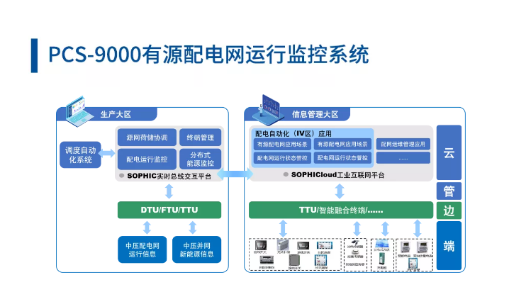 為解決分布式能源大量接入配電網(wǎng)帶來的平衡、穩(wěn)定等問題,南瑞繼保研發(fā)了PCS-9000有源配電網(wǎng)運行監(jiān)控系統(tǒng)。該系統(tǒng)綜合應(yīng)用最新的智能電網(wǎng)、物聯(lián)網(wǎng)、計算機、通信和信息集成技術(shù),基于“云-管-邊-端”架構(gòu),采用先進的微服務(wù)和靈活分布式混合架構(gòu),融合有源配電網(wǎng)各類橫向和縱向數(shù)據(jù),構(gòu)建源網(wǎng)荷儲全景模型,實現(xiàn)協(xié)同控制、輸配用轉(zhuǎn)供、故障自愈、電壓無功控制、終端定值校核整定等功能,支持調(diào)度運維人員對有源配電網(wǎng)高效運維、及時感知、精準調(diào)節(jié),保障有源配電網(wǎng)安全、經(jīng)濟運行,提高新能源消納比例。
