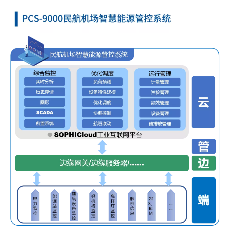 針對機場日益嚴峻的節(jié)能形勢以及“四型機場”的建設(shè)要求,南瑞繼保研發(fā)了PCS-9000民航機場智慧能源管控系統(tǒng)。該系統(tǒng)可應(yīng)用于大型樞紐、干線、支線機場,實現(xiàn)冷熱水電氣等能源介質(zhì)及建筑機電設(shè)備的一體化集中監(jiān)控,通過負荷預(yù)測、多目標優(yōu)化、協(xié)調(diào)控制等智能調(diào)控及計量、能效、設(shè)備、安全等智慧運維功能,基于自主研發(fā)的工業(yè)互聯(lián)網(wǎng)平臺,實現(xiàn)”云管邊端”協(xié)同,全局態(tài)勢感知和指揮決策,支撐智慧機場建設(shè)。