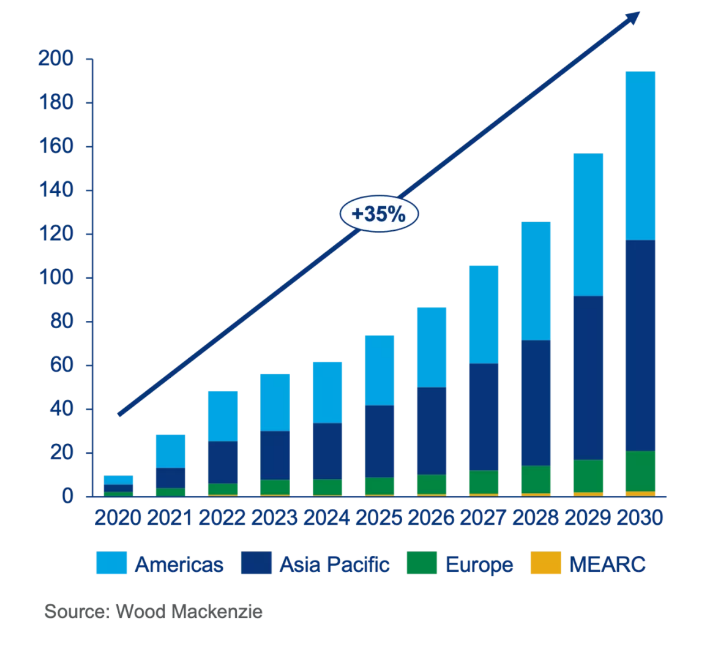 據(jù)伍德麥肯茲最新研究顯示,預(yù)計2021年,全球儲能將新增12GW/28GWh容量部署,同比增長近三倍,至2030年累計儲能裝機(jī)容量將接近1TWh大關(guān)。與此同時,全球鋰離子電池產(chǎn)能有望于未來兩年內(nèi)翻番。
