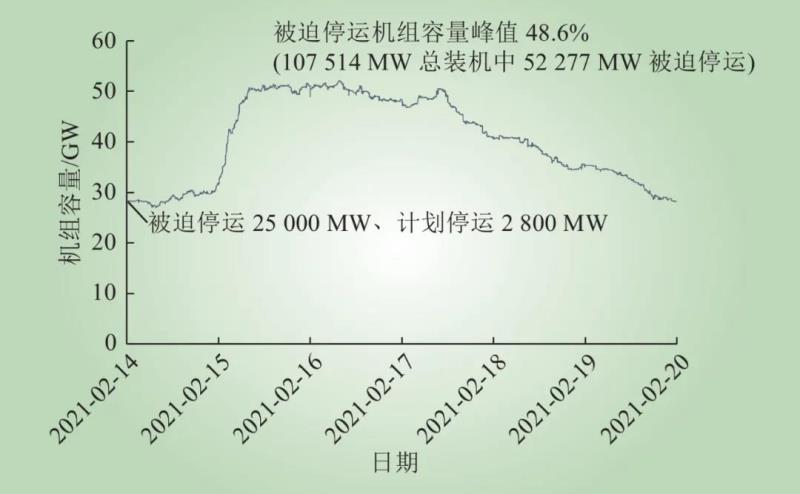 2021年2月12日—17日,暴風(fēng)雪席卷美國(guó)南部、中西部和東北部地區(qū)。美國(guó)得克薩斯州(下文簡(jiǎn)稱得州)受極寒天氣影響,2月15日—19日發(fā)生大停電事故,最多影響人口達(dá)到450萬(wàn)人。極端寒冷天氣導(dǎo)致電力取暖負(fù)荷急劇攀升,與此同時(shí),因天然氣管道受凍冰堵、風(fēng)機(jī)葉片覆冰凍結(jié),大量燃?xì)夂惋L(fēng)電機(jī)組退出運(yùn)行,甚至部分燃煤機(jī)組也退出運(yùn)行,得州電網(wǎng)電力供需嚴(yán)重失衡。得州當(dāng)?shù)貢r(shí)間02-15T01:25,得州電力可靠性委員會(huì)(Energy Reliability Council of Texas,ERCOT),即得州電網(wǎng)調(diào)度機(jī)構(gòu),宣布啟動(dòng)最高等級(jí)的三級(jí)緊急狀態(tài),針對(duì)居民用戶和小型工商業(yè)用戶采取輪流停電措施,最大切負(fù)荷達(dá)2 000萬(wàn)kW,實(shí)時(shí)市場(chǎng)價(jià)格超過(guò)9000美元/(MW·h),直到02-19T10:35才全面恢復(fù)正常供電。