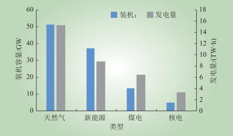 圖1 2020年美國(guó)電源裝機(jī)和發(fā)電量結(jié)構(gòu)