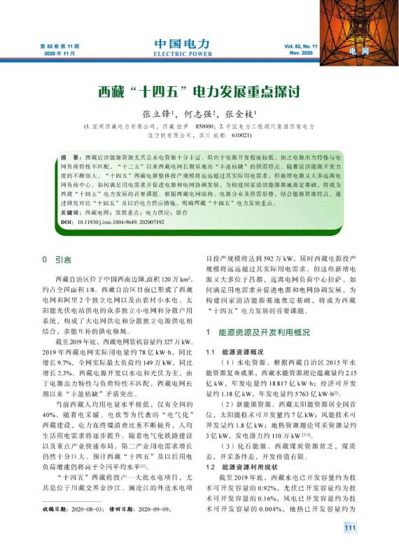 張立鋒, 何志強(qiáng), 張金枝. 西藏“十四五”電力發(fā)展重點(diǎn)探討[J]. 中國(guó)電力, 2020, 53(11): 111-115, 138.