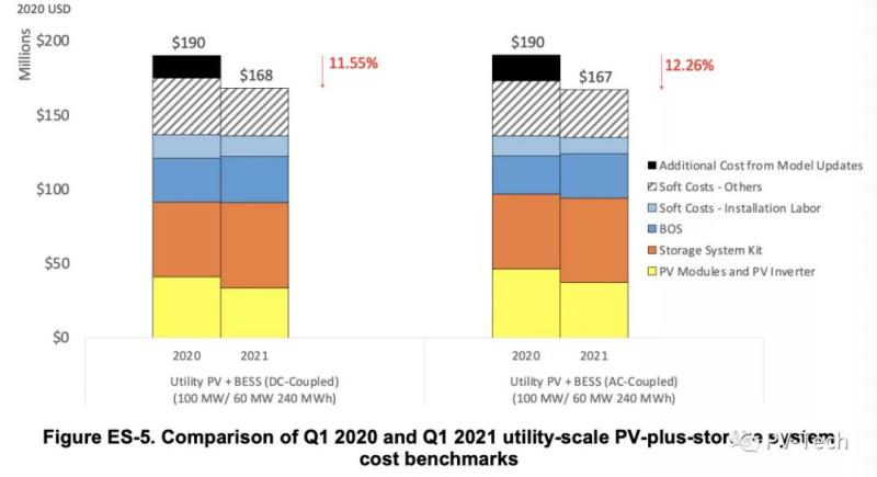 研究人員發(fā)現(xiàn),一個(gè)100MW公用事業(yè)單軸太陽(yáng)能電站的成本從1.02美元/Wdc降至0.89美元/Wdc,降幅為12.31%。一個(gè)60MW/240MWh獨(dú)立電池儲(chǔ)能系統(tǒng)(BESS)的安裝成本從437美元/kWh降至379美元/kWh,降幅為13.14%。