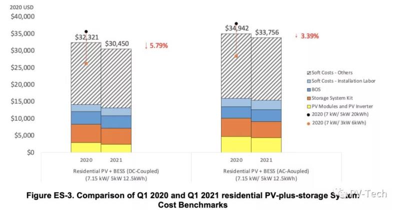 報(bào)告使用了自下而上的方法,考慮了所有系統(tǒng)和項(xiàng)目的開發(fā)成本,比較了從2020年一季度到2021年一季度各種技術(shù)的安裝成本。NREL的模型和基準(zhǔn)成本涵蓋住宅、商業(yè)和公用太陽(yáng)能、太陽(yáng)能+儲(chǔ)能和獨(dú)立儲(chǔ)能
