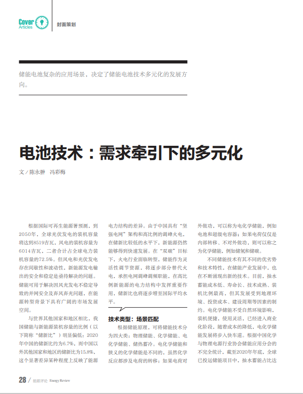 根據(jù)國(guó)際可再生能源署預(yù)測(cè),到2050年,全球光伏發(fā)電的裝機(jī)容量將達(dá)到8519吉瓦,風(fēng)電的裝機(jī)容量為6014吉瓦,二者合計(jì)占全球電力裝機(jī)容量的72.5%。但風(fēng)電和光伏發(fā)電存在間歇性和波動(dòng)性,新能源發(fā)電輸出的安全和穩(wěn)定是亟待解決的問(wèn)題。儲(chǔ)能可用于解決因風(fēng)光發(fā)電不穩(wěn)定導(dǎo)致的并網(wǎng)安全及棄風(fēng)棄光問(wèn)題,在能源轉(zhuǎn)型背景下具有廣闊的市場(chǎng)發(fā)展空間。