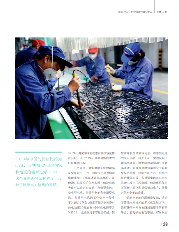 與世界其他國(guó)家和地區(qū)相比,我國(guó)儲(chǔ)能與新能源裝機(jī)容量的比例(以下簡(jiǎn)稱(chēng)“儲(chǔ)新比”)明顯偏低:2020年中國(guó)的儲(chǔ)新比約為6.7%,而中國(guó)以外其他國(guó)家和地區(qū)的儲(chǔ)新比為15.8%,這個(gè)顯著差異某種程度上反映了能源電力結(jié)構(gòu)的差異。由于中國(guó)具有“堅(jiān)強(qiáng)電網(wǎng)”架構(gòu)和高比例的調(diào)峰火電,在儲(chǔ)新比較低的水平下,新能源仍然能夠得到快速發(fā)展。在“雙碳”目標(biāo)下,火電行業(yè)面臨轉(zhuǎn)型,儲(chǔ)能作為靈活性調(diào)節(jié)資源,將逐步部分替代火電,承擔(dān)電網(wǎng)調(diào)峰調(diào)頻職能,在高比例新能源的電力結(jié)構(gòu)中發(fā)揮重要作用,儲(chǔ)新比也將逐步增至國(guó)際平均水平。