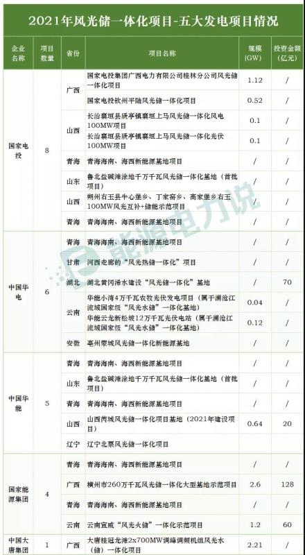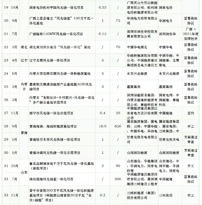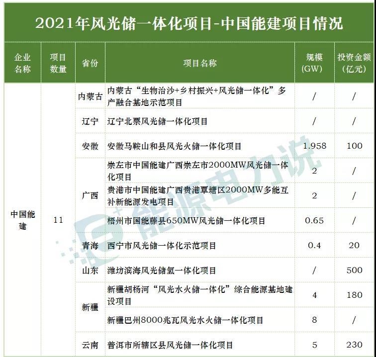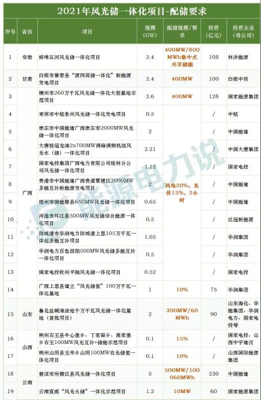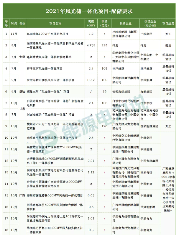 2021年有哪些省份已明確風(fēng)光儲(chǔ)一體化落地項(xiàng)目?項(xiàng)目規(guī)模如何?都有哪些企業(yè)參與投資建設(shè)??jī)?chǔ)能配置要求如何?