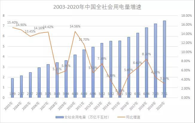 從社會需求看,過去十年全社會用電量同樣保持持續(xù)增長態(tài)勢。即便是疫情肆虐的2020年,全社會用電量依然實現(xiàn)3.1%的增速,達到創(chuàng)紀錄的7.51萬億千瓦時。