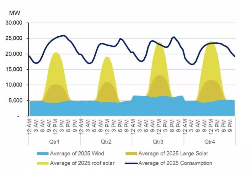 它表明,到 2025 年,風(fēng)能和太陽(yáng)能的總產(chǎn)量有望在一年中的第 3 季度和第 4 季度的中午超過(guò)幾個(gè)小時(shí)的總電力需求。