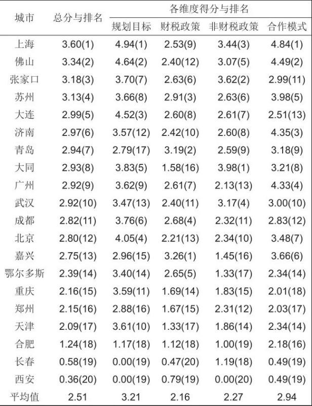 表5 20個(gè)城市燃料電池汽車(chē)政策準(zhǔn)備度及其分維度得分與排名
