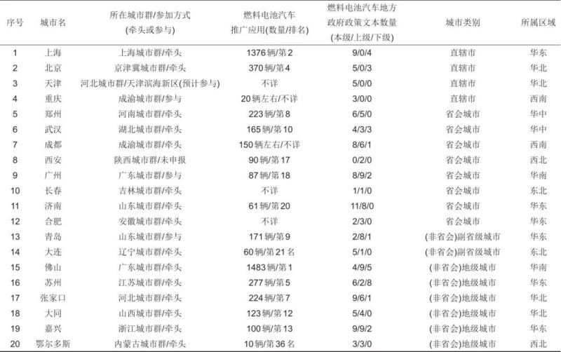 表3中列舉的20個(gè)城市,包括4個(gè)直轄市、8個(gè)省會(huì)城市和8個(gè)非省會(huì)城市,分布在全國(guó)全部七大區(qū)域(華北4個(gè)、華東6個(gè)、華南2個(gè)、華中2個(gè)、東北2個(gè)、西北2個(gè)、西南2個(gè))的18個(gè)省份。從在一定程度上反映政策效果的市場(chǎng)化水平看,在燃料電池汽車(chē)推廣應(yīng)用數(shù)量列全國(guó)前十位的城市中,有2個(gè)推廣數(shù)量較高的城市(深圳和濰坊)未被選入。深圳未選入的原因主要為,該市雖曾出現(xiàn)過(guò)短期的氫燃料電池物流車(chē)推廣熱潮,2019年其累計(jì)推廣數(shù)量即已位居全國(guó)城市總推廣量前三(高達(dá)774輛),但因當(dāng)?shù)責(zé)o加氫條件,這些車(chē)輛實(shí)際大多未在深圳運(yùn)營(yíng);從產(chǎn)業(yè)基礎(chǔ)看,深圳以發(fā)展電動(dòng)汽車(chē)為主,近年來(lái)未出臺(tái)過(guò)燃料電池汽車(chē)支持政策,2019年后當(dāng)?shù)匾酂o(wú)新增燃料電池車(chē)輛推廣。與深圳未選入的原因不同,濰坊的推廣應(yīng)用總量高于同在山東城市群的青島和濟(jì)南,出臺(tái)的政策數(shù)量也不少,但考慮到青島為副省級(jí)城市,在2021年上半年全國(guó)637輛燃料電池汽車(chē)使用涉及的22個(gè)城市中,青島的推廣應(yīng)用量從2020年上半年的第八位躍居為第一位(191輛),且遠(yuǎn)高于其他城市,因此對(duì)于山東城市群,除牽頭城市濟(jì)南外,也把青島選入進(jìn)行評(píng)價(jià)。增選的其他幾個(gè)城市中,天津、重慶為近年來(lái)在加快發(fā)展燃料電池汽車(chē)的直轄市;廣州為近年來(lái)加快布局燃料電池汽車(chē)的省會(huì)城市;西安所在的陜西城市群雖尚未申報(bào),但西安是燃料電池汽車(chē)接入量位居全國(guó)所有城市第17位的省會(huì)城市,在燃料電池汽車(chē)政策和市場(chǎng)發(fā)展相對(duì)較為薄弱的西北地區(qū),有一定代表性。