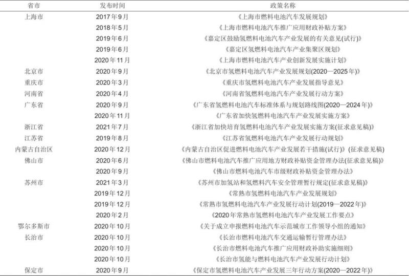 表3 20個(gè)典型城市燃料電池汽車(chē)推廣應(yīng)用及政策出臺(tái)情況(2018年至2021年6月)