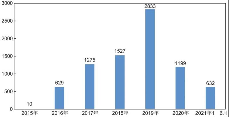 圖1 2015年至2021年6月中國(guó)燃料電池汽車(chē)年產(chǎn)量情況(單位:輛)