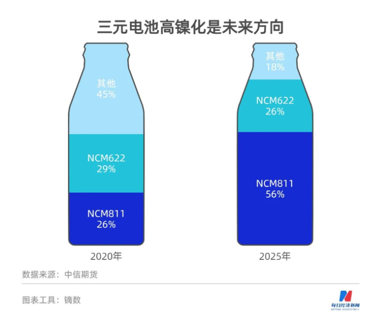 中信期貨數(shù)據(jù)顯示,2020年NCM811(鎳鈷錳占比為8:1:1)和NCM622這兩種高鎳材料占三元材料的比例分別為26%和29%。預計到2025年,NCM811的占比將提高到56%,而NCM622將占比將下降至26%。