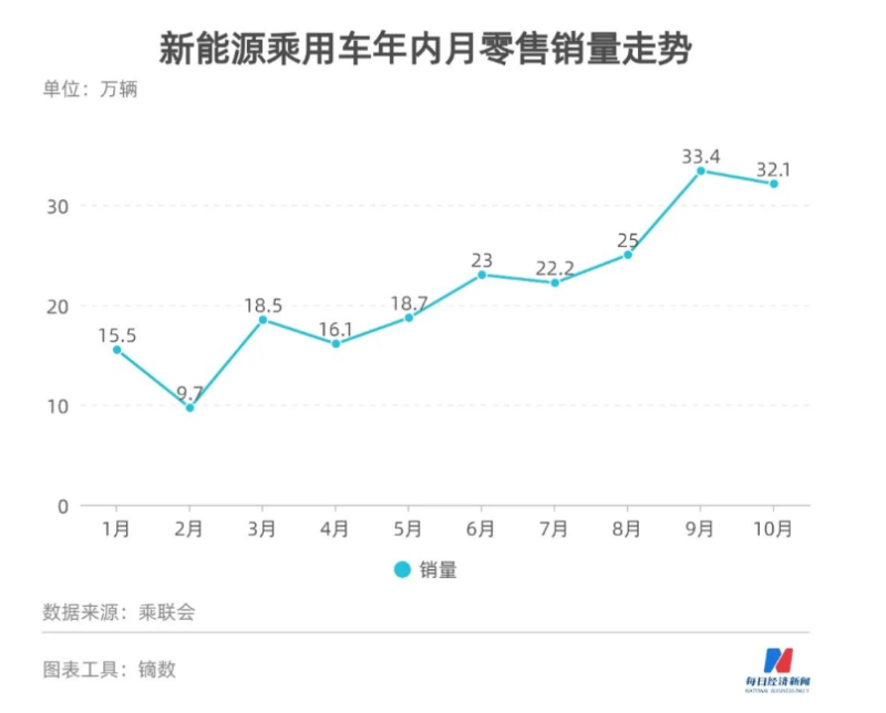 值得一提的是,這樣的成績還是在汽車行業(yè)整體銷量同比下滑的背景下取得的。從整個乘用車市場來看,10月份的零售量為171.7萬輛,同比下降了13.9%。一邊是汽車市場的整體下滑,一邊是新能源汽車的高歌猛進,“冷和熱”的對比之中,足以凸顯新能源汽車發(fā)展之迅猛。
