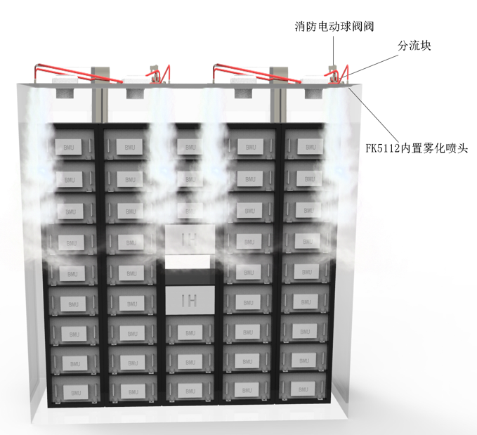 當系統(tǒng)三級告警被觸發(fā)時,打開方艙頂端噴淋管道,將FK5112儲液箱內(nèi)利余液體全部釋放,形成FK5112蒸汽浸沒,達到窒息滅火的目的。如果FK5112緒液箱內(nèi)無剩余或多處電池簇發(fā)生熱失控,則接通外部二次細水霧儲液箱,人工確認后通過消防主機噴淋管道實施細水霧全浸沒處置。