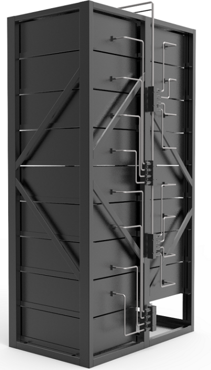 電池模塊在方艙內(nèi)部走廊側(cè)為百葉窗結(jié)構(gòu),通過軟管連接至風(fēng)冷管道。當風(fēng)冷循環(huán)啟動后,管道側(cè)為高靜壓風(fēng)機提供的負壓,即電芯正常工作時產(chǎn)生的熱量通過空氣強對流被吸入風(fēng)冷管道,熱空氣在封閉式的管道內(nèi)部經(jīng)由空調(diào)或者全熱熱交換器轉(zhuǎn)換為冷風(fēng),再通過高靜壓風(fēng)機的冷風(fēng)出口送至方艙內(nèi)部走廊,隨后再次被吸入電池模塊,從而實現(xiàn)艙內(nèi)空氣管道內(nèi)循環(huán)。