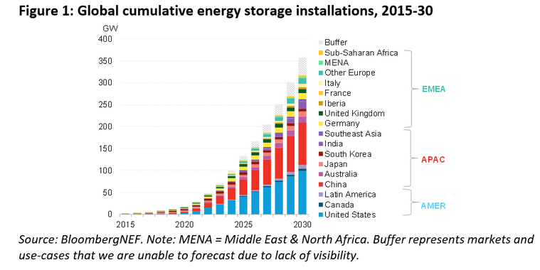 該公司在最近發(fā)布的一份名 為《全球儲(chǔ)能市場(chǎng)展望》調(diào)查報(bào)告中預(yù)測(cè),截至2020年底,全球部署的儲(chǔ)能系統(tǒng)的規(guī)模為17GW/34GWh,未來(lái)十年將投資2620億美元部署345GW/999GWh的儲(chǔ)能系統(tǒng),到2030年累計(jì)部署量將達(dá)到358GW/1,028GWh。