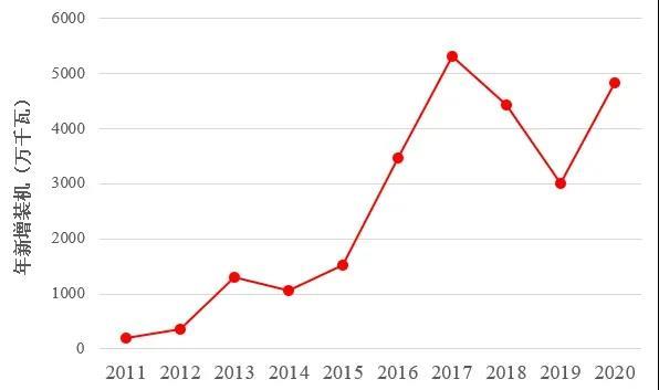 圖:國(guó)內(nèi)近10年光伏年新增裝機(jī)規(guī)模