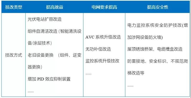 光伏電站的技改,根據(jù)目的不同,大致可以分為三類(lèi),如下表所示。