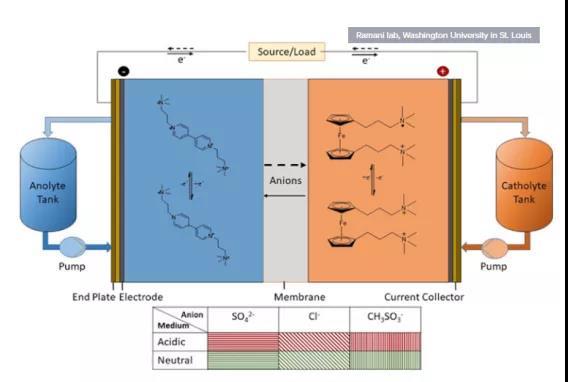 研究人員觀察了兩種活性物質(zhì),其中包括二氯二茂鐵(ferrocene dichloride)陰極和四氯化丙基紫精(propyl viologen tetrachloride)陽極,以及中性和酸性pH下的6種電解質(zhì)(硫酸、鹽酸、甲烷磺酸、硫酸鈉、氯化鈉和甲烷磺酸鈉)。