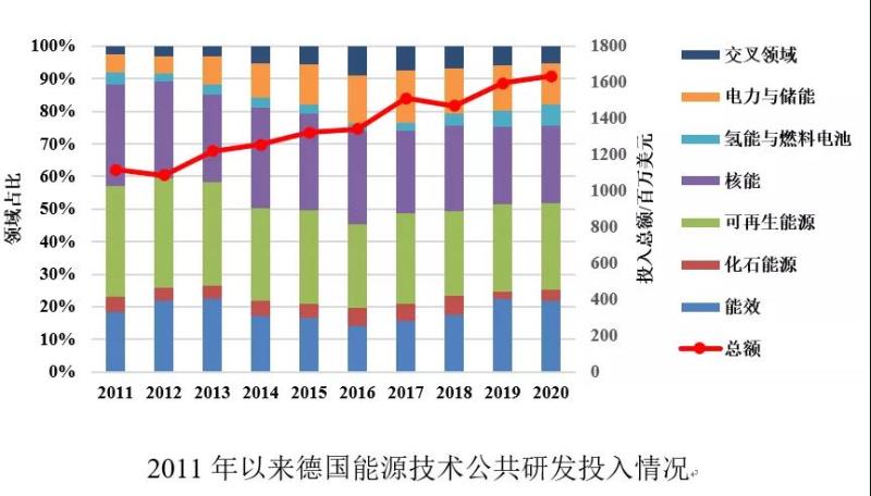 2011年以來德國能源技術公共研發(fā)投入持續(xù)增加。從研發(fā)重點來看,可再生能源、能效和核能技術領域一直是德國研發(fā)投入的重點,核能領域的投入占比近年來逐漸降低,反映出德國逐步降低核能所占比重、加快發(fā)展可再生能源的戰(zhàn)略方向。