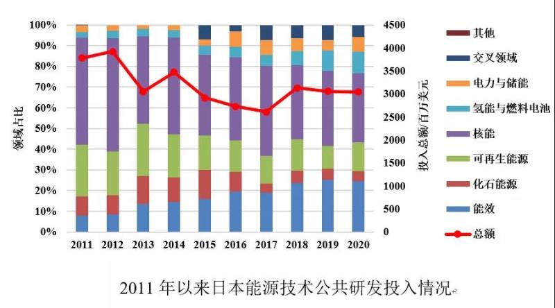 核能一直是日本公共研發(fā)投入最多的能源技術領域,但從2011年福島核事故以來,其占比逐漸降低。日本近年來加大了對能效、氫能與燃料電池、交叉領域的研發(fā)投入力度,降低了對化石能源技術領域研發(fā)的支持,反映出日本發(fā)展多元化能源結(jié)構(gòu)、降低能源對外依存度的戰(zhàn)略考慮。