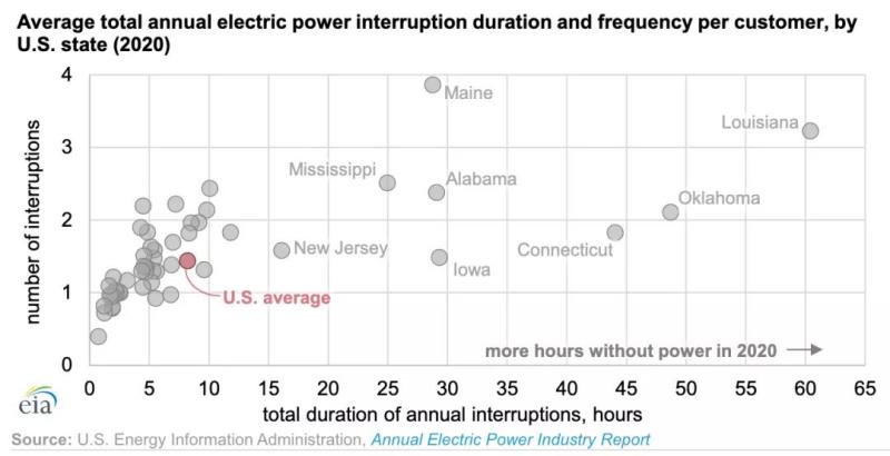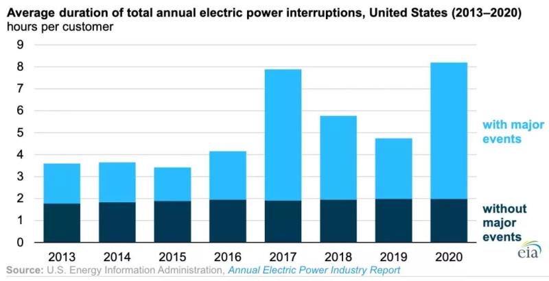 中國(guó)儲(chǔ)能網(wǎng)訊:根據(jù)美國(guó)能源信息署(EIA)最新發(fā)布的《年度電力行業(yè)報(bào)告》 ,平均而言,美國(guó)電力用戶在2020年經(jīng)歷電力中斷時(shí)間略超過(guò)8小時(shí),這是自2013年EIA開(kāi)始收集電力可靠性數(shù)據(jù)以來(lái)停電時(shí)間最長(zhǎng)的一年。