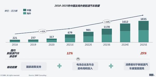 2021年,全球新能源汽車預(yù)計總銷量為680萬輛,同比增長近115%,其中,中國預(yù)計全年銷量為300萬輛,滲透率將達(dá)12%。到2025年,機構(gòu)預(yù)計國內(nèi)新能源汽車滲透率有望提升至25%。