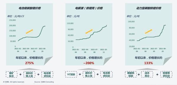 近日,在由上海期貨交易所和上海有色金屬網(wǎng)(SMM)共同舉辦的2021年有色金屬行業(yè)年會上,鋰電產(chǎn)業(yè)鏈企業(yè)人士齊聚,探討漲價潮下的應(yīng)對方式和行業(yè)未來發(fā)展方向。SMM新能源研究咨詢總監(jiān)易彥婷對記者表示,受新能源車滲透率提升、電池需求拉動,鋰電各材料的需求量、價格均大幅增長。2021年初至今,鋰電池各大主材大幅漲價,碳酸鋰價格上漲約275%,正負(fù)極、隔膜、電解液價格上漲普遍為50~500%。隨著新能源行業(yè)由粗放增長逐步邁入供需平衡的階段,如何定價、穩(wěn)定供應(yīng)鏈成為全產(chǎn)業(yè)鏈的焦點。
