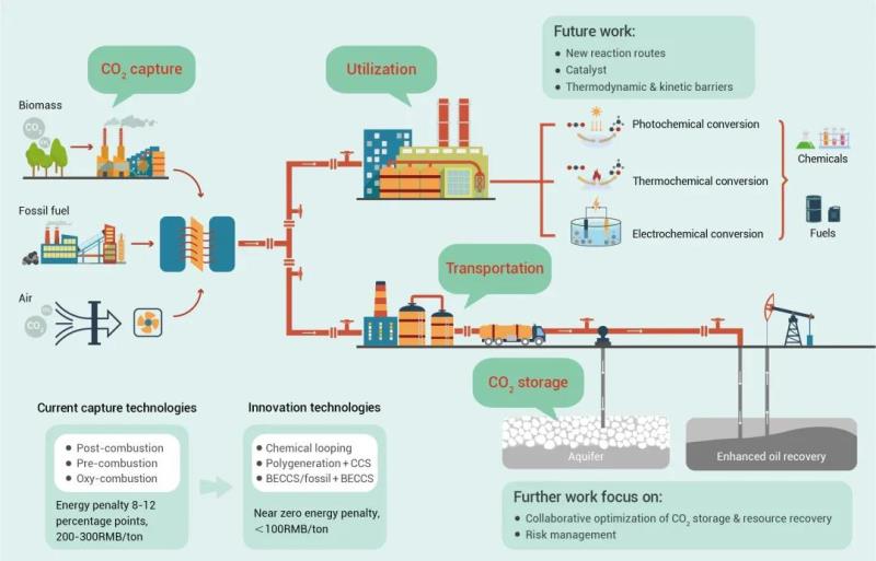 CCUS, technologies for carbon capture, utilization, and storage, are critical to achieving C neutrality (Fig. 5). CCUS technologies need innovations, targeting CO2 recovery with low energy or even zero energy penalty, and aiming collaborative optimization of CO2 storage and resource recovery and risk management. Chemicals-power polygeneration and chemical looping combustion with CO2 capture have the potentials to realize low-cost CO2 capture. Fossil fuels combined with renewable energy for CO2 capture, the complementary energy systems, may play an important role for future CCUS. The conversion of CO2 into fuels and chemicals is a promising direction for C reduction.