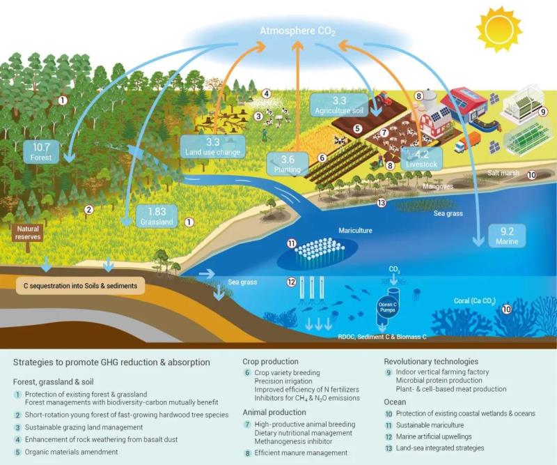 為實(shí)現(xiàn)全球生態(tài)系統(tǒng)碳中和,迫切需要減少農(nóng)業(yè)食物源溫室氣體排放和提高生物圈的碳固持量(圖3)。選育優(yōu)良作物和家畜品種,農(nóng)田精準(zhǔn)灌溉、施肥與土壤增碳,優(yōu)化家畜飼養(yǎng)和糞便管理,變革基于土地利用的動(dòng)植食物生產(chǎn)等措施,以減少農(nóng)業(yè)食物源溫室氣體排放;實(shí)施可持續(xù)管理森林草地生態(tài)系統(tǒng),增強(qiáng)巖石風(fēng)化作用和采用生物炭技術(shù)等措施提高陸地生態(tài)碳匯;通過(guò)保護(hù)濱海濕地與海洋生態(tài)系統(tǒng),實(shí)施可持續(xù)海水養(yǎng)殖、人工涌升流和陸海一體化戰(zhàn)略,提升海洋生態(tài)系統(tǒng)碳匯能力。