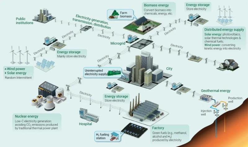 對(duì)標(biāo)碳中和,實(shí)現(xiàn)一次能源有序減量替代,需大力發(fā)展可再生能源??稍偕茉词且粋€(gè)完整的技術(shù)體系,不僅需要太陽(yáng)能、風(fēng)能、地?zé)崮?、海洋能等,更需要?chǔ)能技術(shù)的配合,形成真正的新能源體系。核能與氫能具有清潔低碳、綠色環(huán)保等優(yōu)點(diǎn),是實(shí)現(xiàn)碳中和目標(biāo)的重要技術(shù);生物質(zhì)能也是實(shí)現(xiàn)能源結(jié)構(gòu)調(diào)整的重要支撐。本文總結(jié)了可再生能源大規(guī)模應(yīng)用中的關(guān)鍵核心技術(shù),以及這些關(guān)鍵核心技術(shù)對(duì)實(shí)現(xiàn)碳中和目標(biāo)的影響,同時(shí)對(duì)這些技術(shù)未來(lái)的發(fā)展進(jìn)行了展望(圖2)。