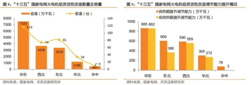 《電力發(fā)展“十三五”規(guī)劃》明確提出,全面推動煤電機(jī)組靈活性改造?!笆濉逼陂g,將在“三北”地區(qū)推行熱電機(jī)組靈活性改造約 1.33 億千瓦,純凝機(jī)組改造約 8200 萬千瓦;其它地方純凝改造約 450 萬千瓦。改造完成后,將增加調(diào)峰能力 4600 萬千瓦,其中“三北”地區(qū)增加 4500 萬千瓦。根據(jù)國家電網(wǎng)發(fā)布的《服務(wù)新能源發(fā)展報(bào)告 2021》,2020 年“三北”地區(qū)完成火電機(jī)組改造 2466 萬千瓦。“十三五”期間,國家電網(wǎng)經(jīng)營區(qū)內(nèi)累計(jì)完成火電機(jī)組改造 1.62 億千瓦,其中“三北”地區(qū)完成火電機(jī)組容量改造 8241 萬千瓦,提供調(diào)節(jié)能力 1501 萬千瓦。