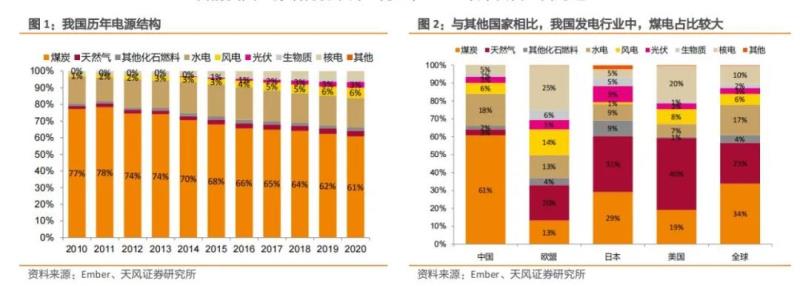 堅(jiān)持能耗雙控,減排工作較為緊迫。近期國常會在提出“中央發(fā)電企業(yè)要保障所屬火電機(jī)組應(yīng)發(fā)盡發(fā)”的同時(shí),明確要堅(jiān)決遏制“兩高”項(xiàng)目盲目發(fā)展;并提出做好分類調(diào)節(jié),對高耗能行業(yè)可由市場交易形成價(jià)格,不受上浮 20%的限制,可見減排工作仍較為緊迫。目前我國電源結(jié)構(gòu)仍以煤電為主,2020 年煤炭發(fā)電占比達(dá) 61%。