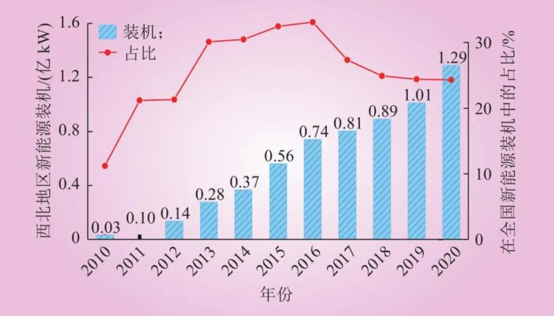 圖2 2010—2020年西北地區(qū)的新能源裝機(jī)情況
